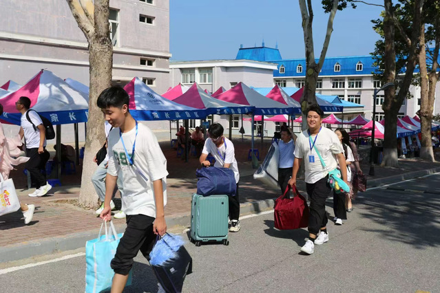 迎新现场,各学院精心布置迎新场地,由辅导员、学生志愿者组成的迎新团队热情地迎接着来自全国各地的新生。学生志愿者热情接引,用手推车帮新生搬运沉重的行李;辅导员们耐心解答新生及家长疑问,重点关注特殊学生群体,细致地讲解新生所选专业未来发展及就业等新生及家长关心的问题。