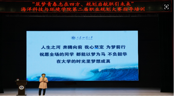 为进一步提升大学生的职业生涯规划意识与能力,积极备战即将到来的第二届职业规划大赛校赛,11月20日海洋科技与环境学院在俱乐部组织举办了“筑梦青春志在四方 规划启航职引未来”职业规划大赛指导讲座。本次讲座由海洋科技与环境学院党委书记谭利娟主讲,学院800余名本科及研究生参加了讲座。