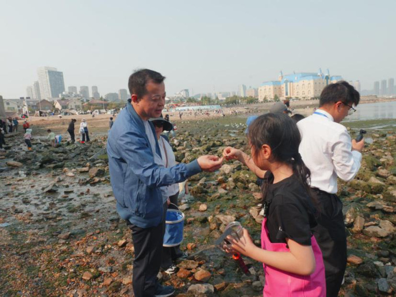 黑石礁湾赶海现场,蔡恒江、王珊针对大家捕捉到的海洋生物,为中小学生和家长现场详细讲解其生活习性、演化进程、社会价值等,中小学生及家长踊跃提问,专业教师们耐心讲解海洋科学领域前沿知识与技术应用,充分展示了现代科技与海洋生物的魅力。