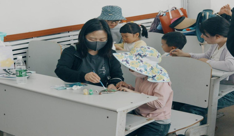 在海洋肌理画手工DIY环节,中小学生充分发挥想象力,用手中的画笔、水彩、亮粉等勾勒、装点贝壳,绘就心中的大海。