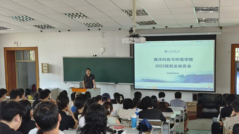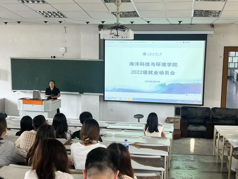 为推动2026届毕业生就业工作,做到就业工作早启动、早动员、早推进,9月4日,海洋科技与环境学院在综合实验楼综阶2教室2022级学生就业动员会。学院党委书记谭利娟、党委副书记刘宁及全体2022级学生参加会议。会议由2022级辅导员张光耀主持。