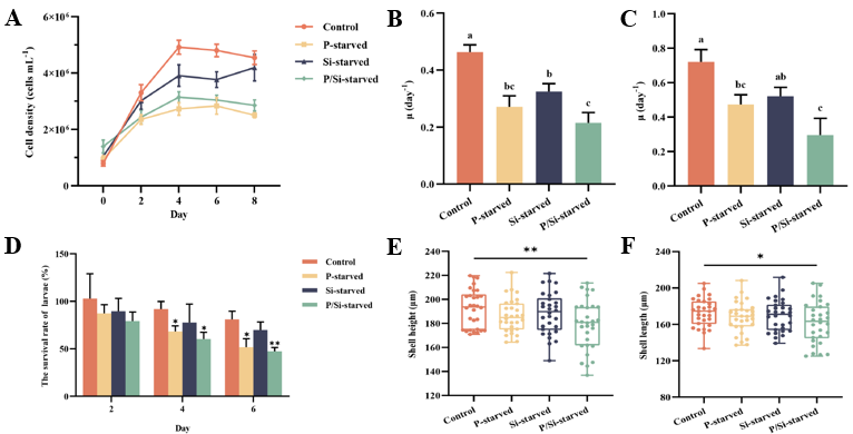 近年来,北黄海近岸养殖区磷、硅限制日益加剧,其对浮游藻类及以其为食的贝类幼虫的影响引发广泛关注。该研究聚焦该海域优势硅藻—小新月菱形藻,系统评估了磷、硅限制对其生长、形态和脂肪酸组成的影响,并揭示了其对牡蛎幼虫的级联生态效应。研究发现,营养盐限制显著抑制小新月菱形藻的生长,其中磷限制导致藻细胞皱缩,硅限制破坏其硅壳结构;脂肪酸分析显示,磷、硅共限制导致藻细胞中饱和脂肪酸(SFA)含量升高,而多不饱和脂肪酸(PUFA)含量下降,同时n-6/n-3 PUFA比值升高。以磷、硅受限的小新月菱形藻作为饵料投喂6天后,长牡蛎壳顶幼虫的存活率和生长率显著下降,促炎细胞因子CgIL17-1、CgTNF-1和CgTNF-2的mRNA表达水平显著升高,表明营养限制的饵料可诱导幼虫发生慢性炎症,进而影响其健康发育。本研究首次从“营养盐—饵料藻—贝类幼虫”链条角度,系统揭示了近岸养殖区限制的生态学效应,研究结果为深入理解营养盐限制对近海养殖生态系统的影响提供了新见解,对促进贝类养殖业高质量发展具有重要意义。